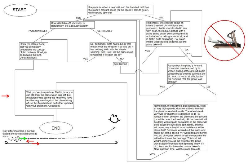 Werd, a simple free body diagram will show that the plane will progress forward through the air since there is there no force to stop it, the treadmill is negligible for all intensive reasons. Show me a freely spinning bearing (that's not seized of course) that can some how impede thousands of pounds of force and Ill give you $100