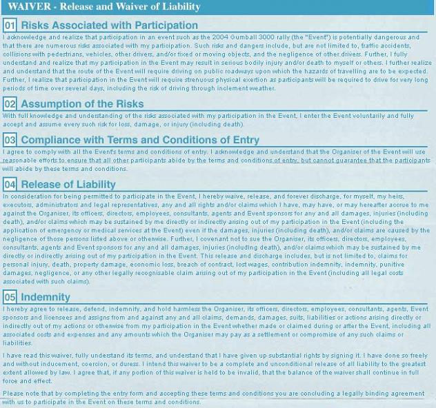Stole this from the Gumball site. It looks like you might be able to release yourself from any and all liability with some sort of a waiver. I have no idea if this would hold up in a court, but it's a good idea to get signatures anyway, right?