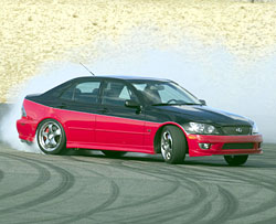 The monster IS received other adjustments, too: a more drag-friendly 3.769:1 final drive with a limited-slip differential; 16-way adjustable shocks; big, cross-drilled Brembo ventilated disc brakes with four-piston calipers; Speed Star SSR 18-inch wheels wrapped with Michelin Pilot Sport Cup tires, 225/40R front and 265/35R rear, and with ZR speed ratings; Rhys Millen Racing (Rod¡¦s son) front lip spoiler and side skirts to go with the IS 300 rear spoiler; a Chip Foose black-over-red paint job; and the requisite Mark Levinson stereo, in this case, a 720-watt multichannel system with 20 speakers.