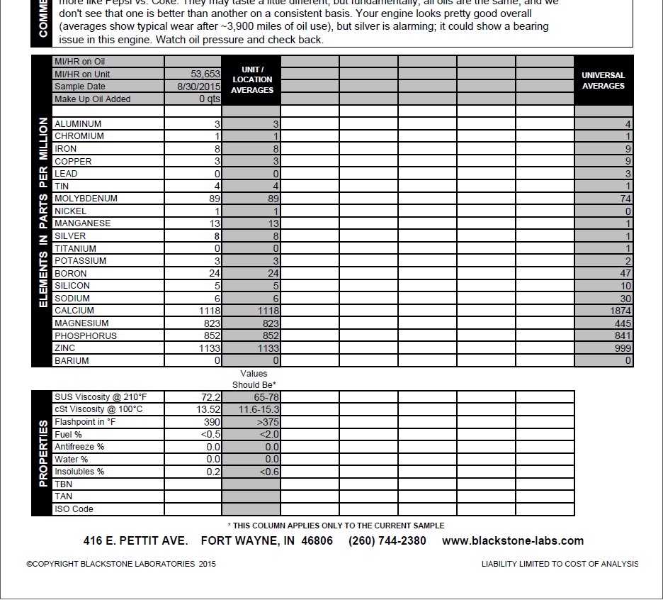 Anyways, now that i'm 50,000+ I decided to try out these oil reports some people talk about just for ****s and giggles, except I have a very high Silver reading. I'm running rotella T6 last 3 changes but really can't tell a difference one way other another after I switched from RP and have been using it cause it's cheap.