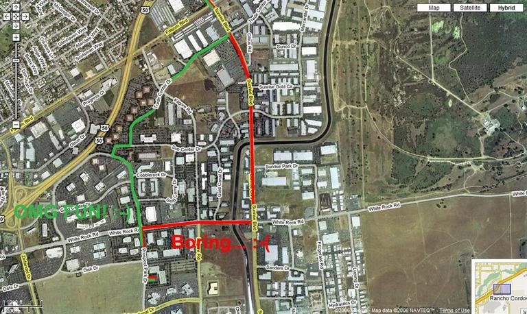 There's one stoplight on Prospect which is usually red, this makes for good launch practice, then a straightaway where you can go WOT. Sharp right onto Sun Center, and another quick right, then a sharp left. Finally, one more stop sign at Kilgore, then another pretty much straightaway to Sunrise. I usually head home after 6pm so there are few cars and slowies through the business park.