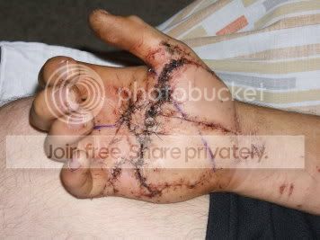 OUCH that hand looks NICE! I got real lucky & didnt get any broken bones cause after i bounced off the top of the barbwire i flew into a field... glad i drank my milk when i was a kid. I kicked off the bike hard when i saw i was going for the barbwire, if i hadnt i think some sort of egg slicer thing woulda happened & i'd probably be dead.. I was wearing cargo pants & a t-shirt but i did have gloves & my helmet thank god.
