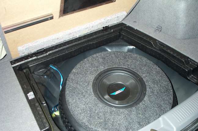 That's a 10" Image Dynamics sub in a custom fiberglass enclosure. Completely removeable in case you need to use the spare.
