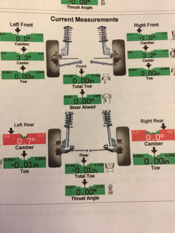 Just got my car aligned I think I have a bad tire cause it's still pulling to the right but it also still pulls to the left randomly. I can't get this f***ing car just to go straight. Do these measurements look right ? I see the left rear is at .7 while the right is .0? Any info would be much appreciated